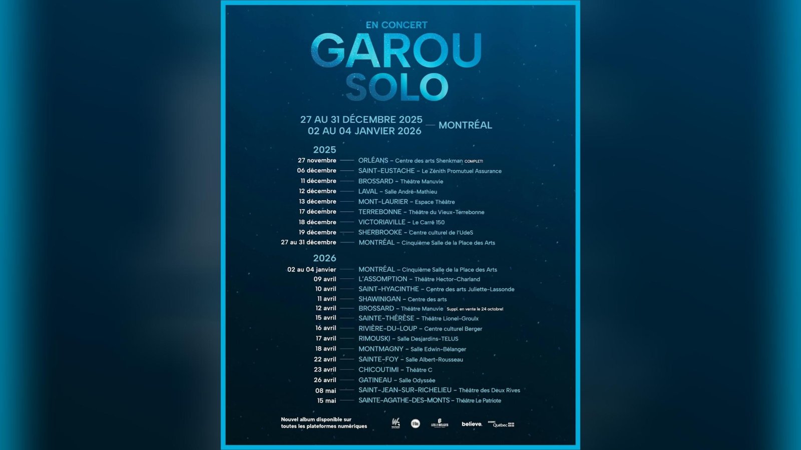 Garou terminera l’année en beauté avec une série de cinq soirs à Montréal, du 27 au 31 décembre 2025, à la Cinquième Salle de la Place des Arts, puis reprendra avec trois autres représentations au même endroit du 2 au 4 janvier 2026.